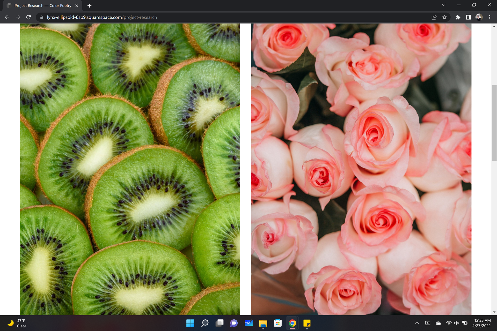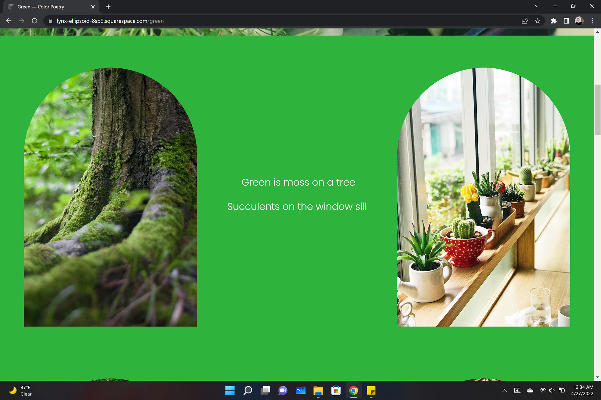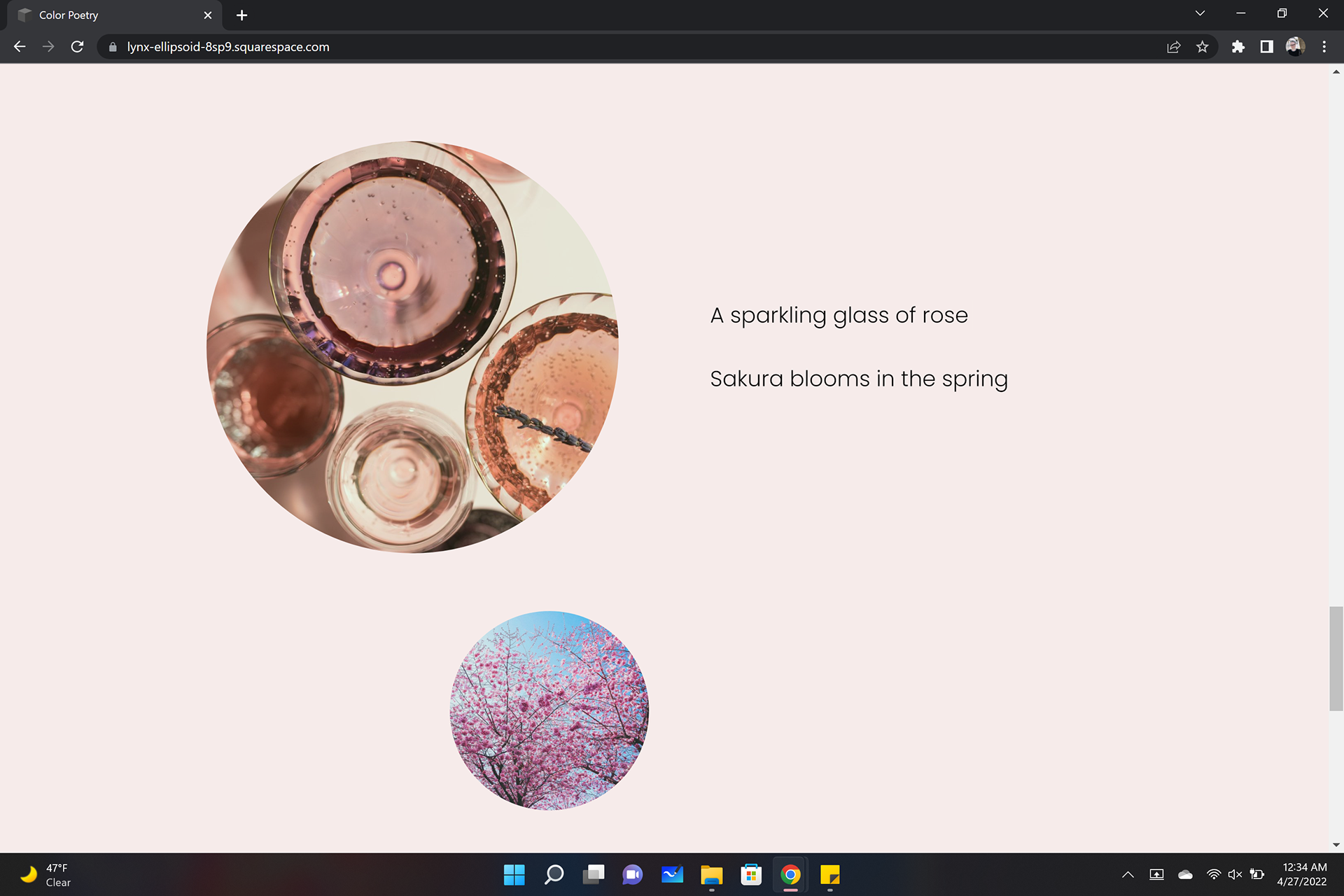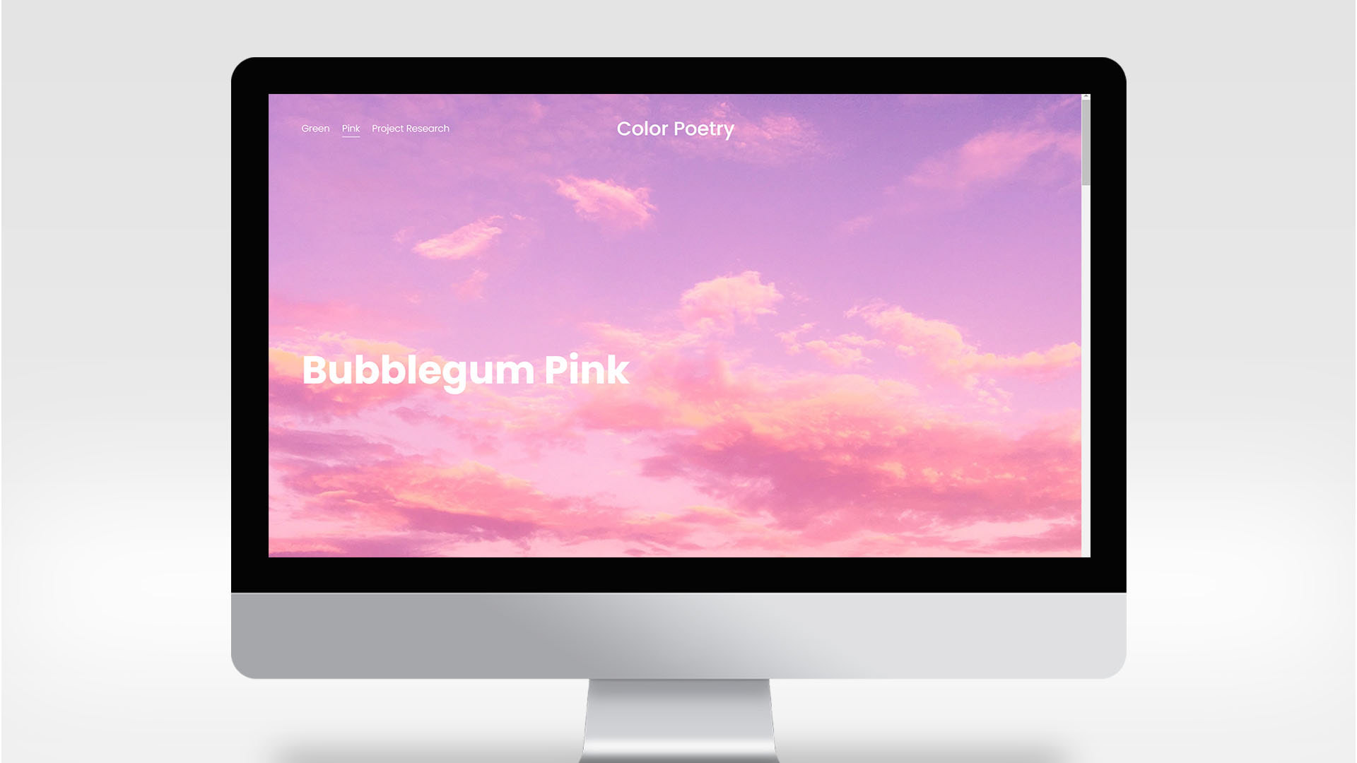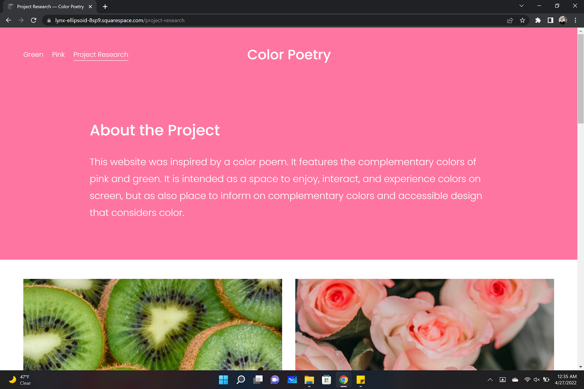 This site showcases the imagery and poetry based on the complementary colors, pink and green. Requirements were to write color poems, poems that express feelings or describe the color, and find imagery to match, then compile the two into a colorful experience. I chose to make my pink page more bubbly and give it a floaty feel with the images in circles and placed to look like floating bubbles. In my green page I used window shapes for the images to give a more grounded feel as if looking through to the images.
